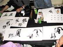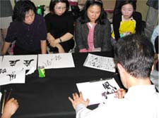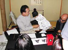 | 「人前ではよう書かんのですわぁ」とおっしゃりながらも、実際に書いてみてくださった。みんな真剣に見入っている。 | 同じ字をいろいろなパターンで書き分けて頂いた。合間では、いろいろと質問も飛び出し、あっという間に時間が過ぎた。 |